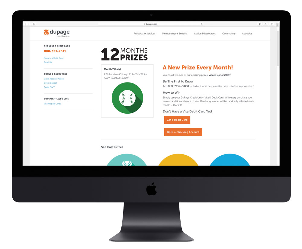 DuPage Credit Union’s year long Debit card promotion where Members have a chance to win a new prize every month. 12 Months, 12 Prizes is advertised across print and digital platforms. I designed the promotion logo, hero ad, and icons. I was also responsible for updating and maintaining the web page.