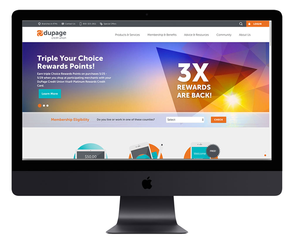 Homepage & landing page banner images for DuPage Credit Union’s 3X Rewards promotion during Memorial Day weekend for the Visa Platinum Rewards Credit Card. Members were notified via Email and through the Hero ad and landing page.