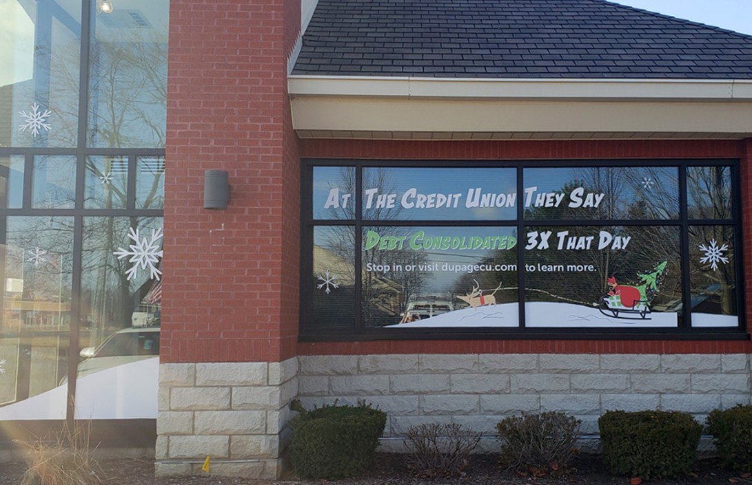 Window graphics for DuPage Credit Union’s Holiday Debt Consolidation campaign.