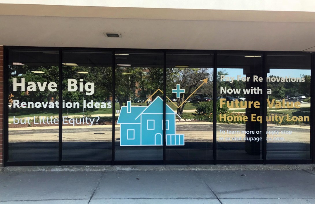 Window graphics for DuPage Credit Union’s Future Value Home Equity Loan.